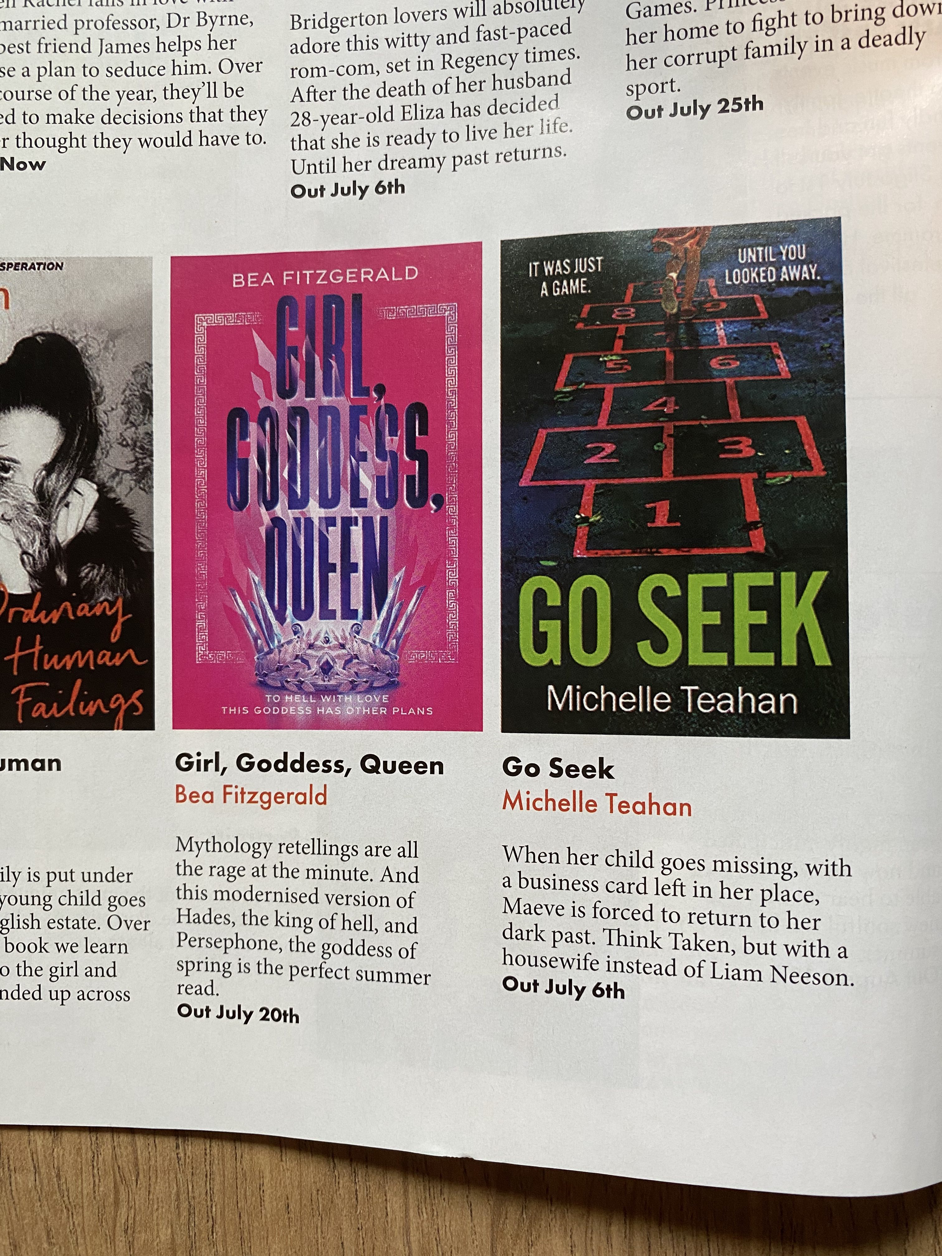 There are a lot of firsts when your debut is published and I’ve discovered I have a lot to learn. All of those books and workshops about how to get published never really covered the ‘after’ but here I am and so far, I’m loving it. This was a very exciting first – seeing Go Seek sitting pretty on a page in a magazine.
